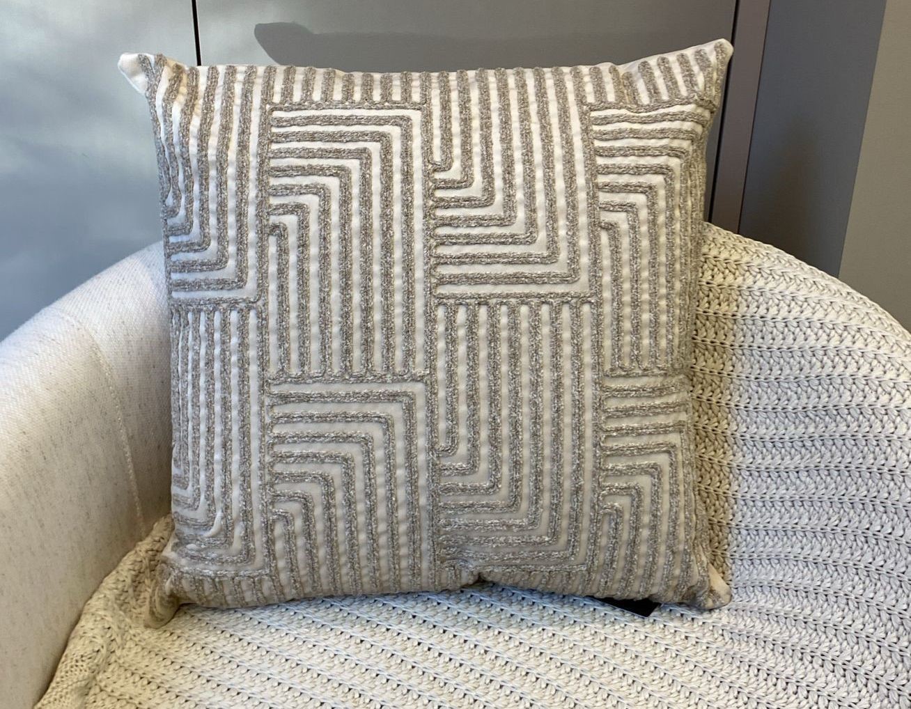 Almofada feita em veludo na cor bege com detalhes de borbados.