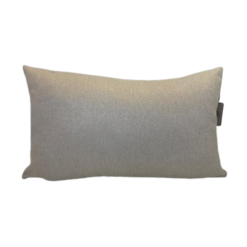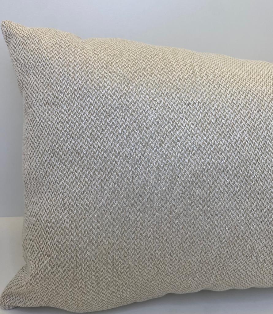 Almofada retangular de veludo, na cor bege e off-white com trama.