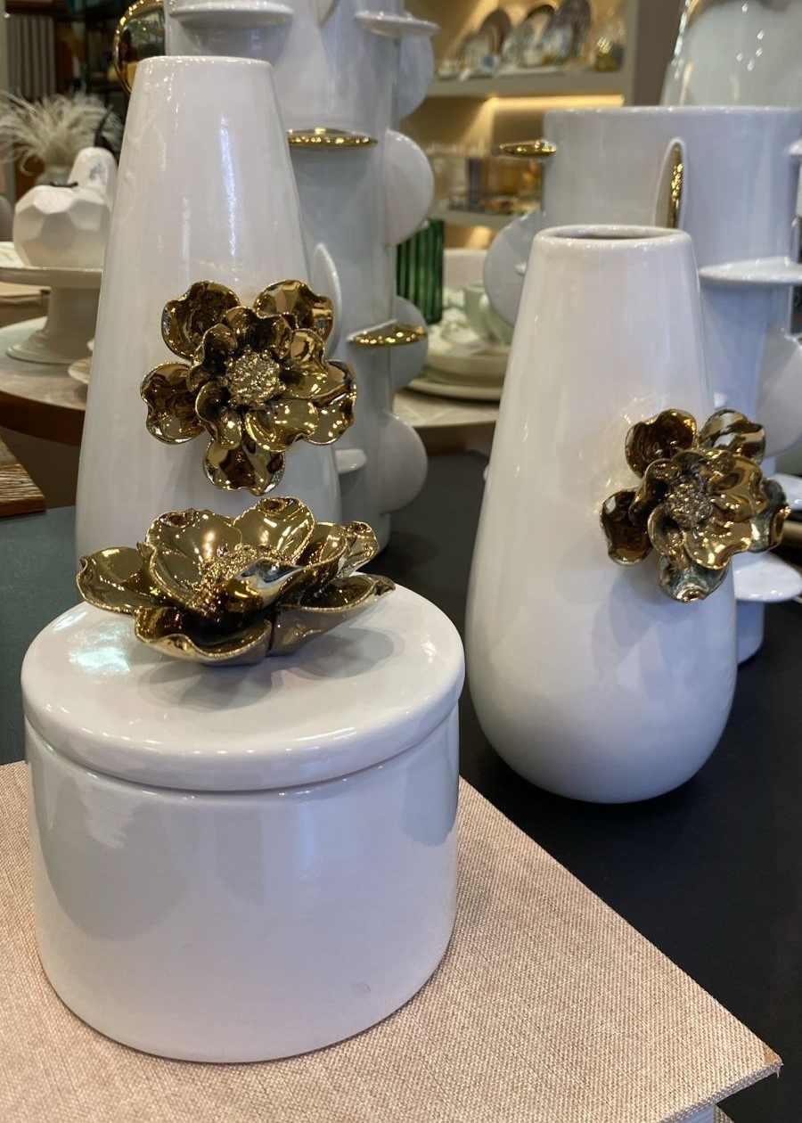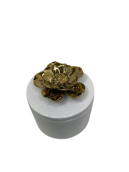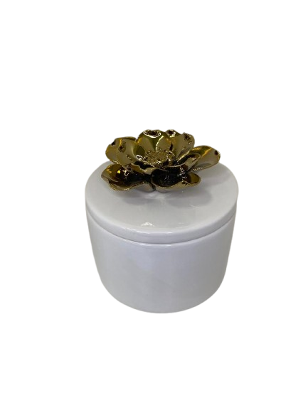 Caixa decorativa feita em cerâmica, na cor branca com detalhe de flor no dourado.