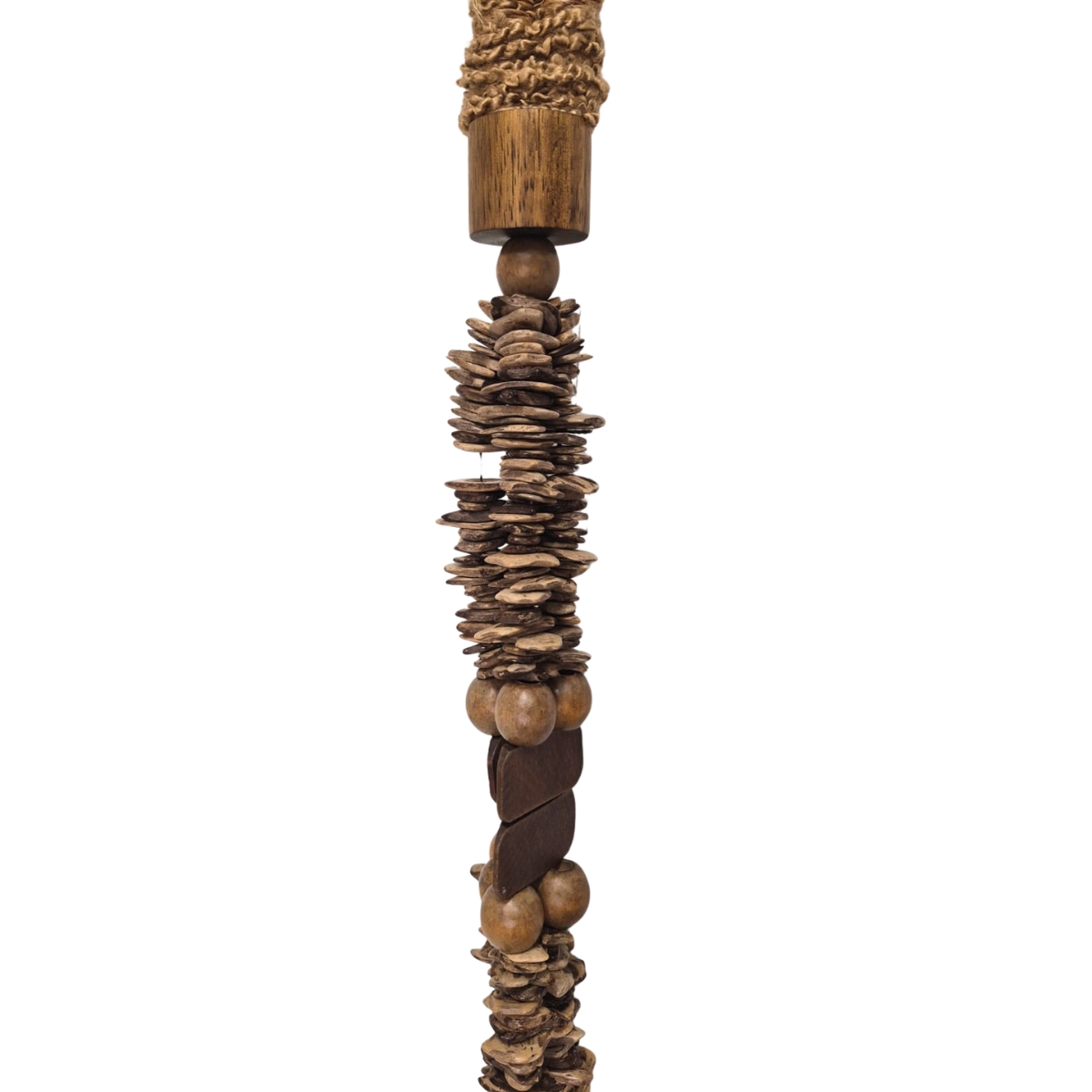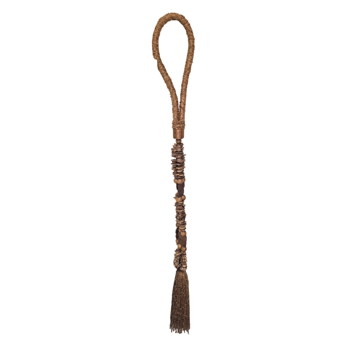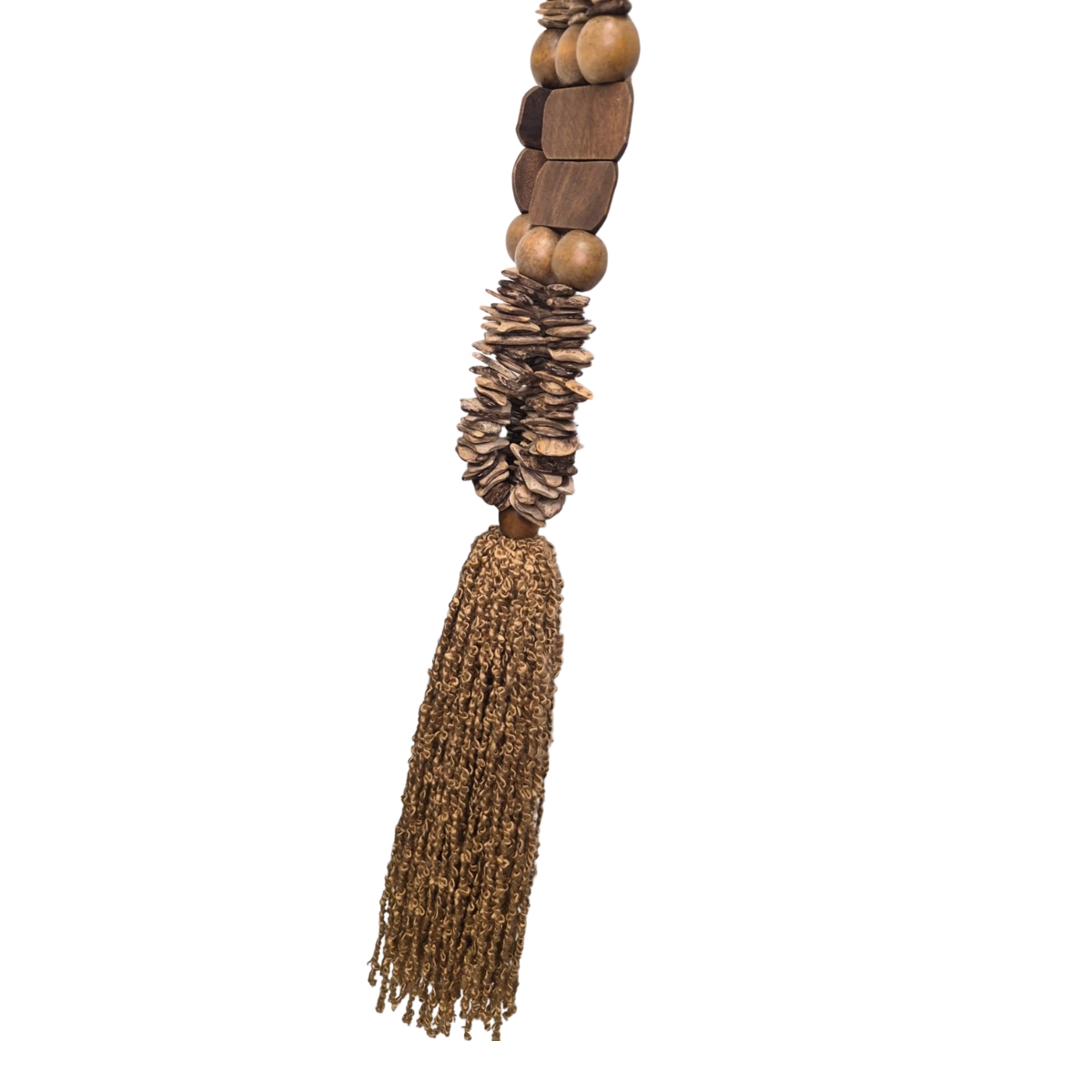 Trata-se de um colar decorativo composto por contas de madeira intercaladas com elementos em sisal, formando uma peça harmoniosa e visualmente leve. Seu acabamento valoriza os materiais naturais, destacando a beleza simples e elegante do design.