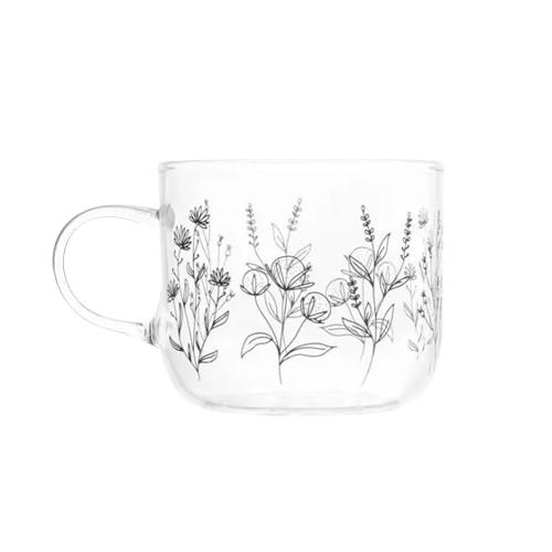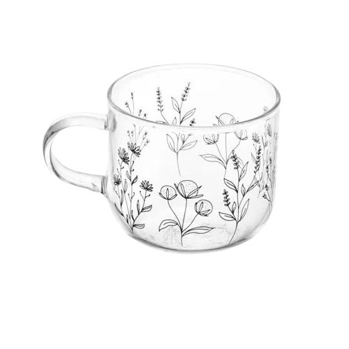 Conjunto de Xícaras para café com 6 unidades, feito em vidro borossilicato resistente ao calor, com detalhes de flores 120ML.