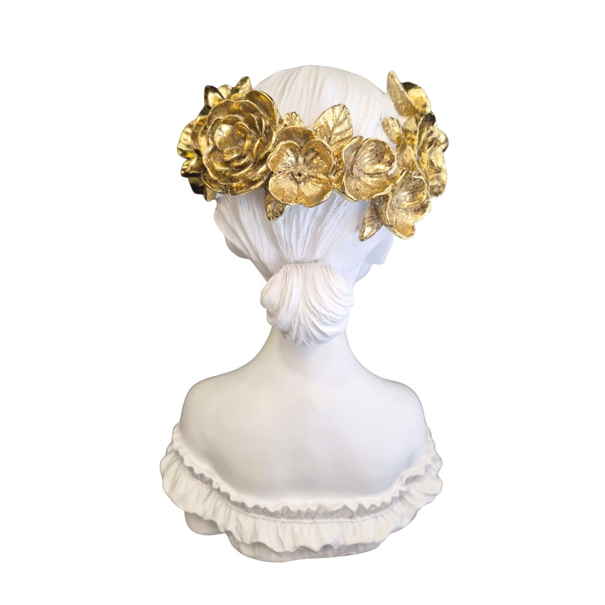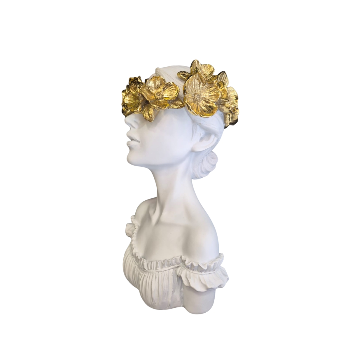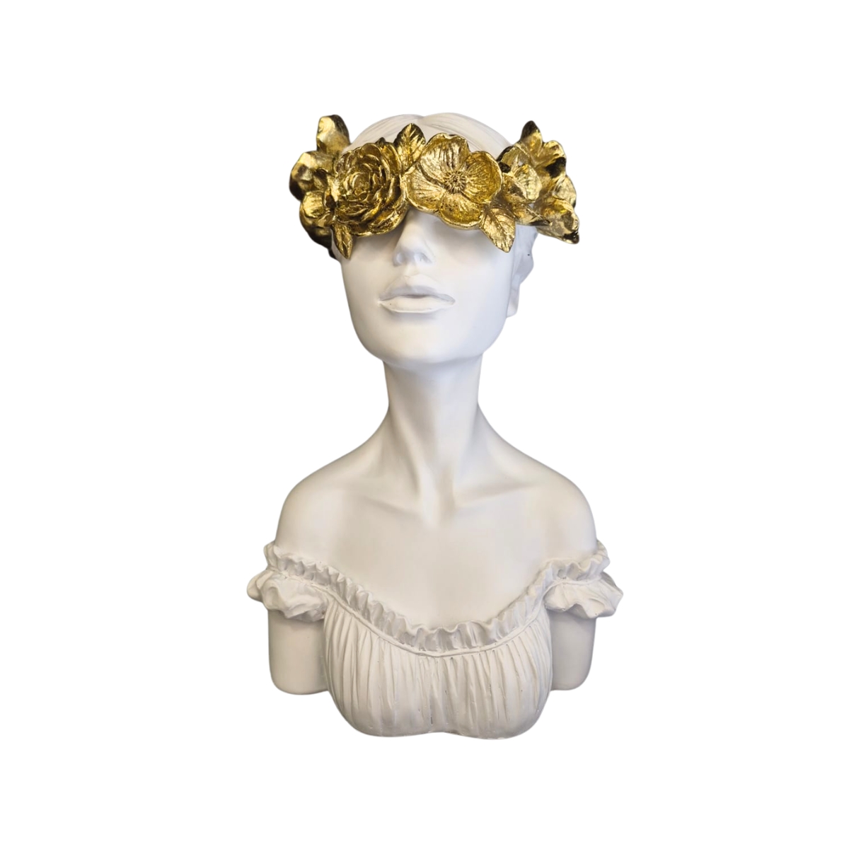 Trata-se de uma escultura decorativa em resina de alta qualidade, representando o busto de uma mulher com acabamento branco fosco. O destaque fica por conta das flores douradas sobre os olhos, que adicionam brilho, contraste e um toque artístico à peça.