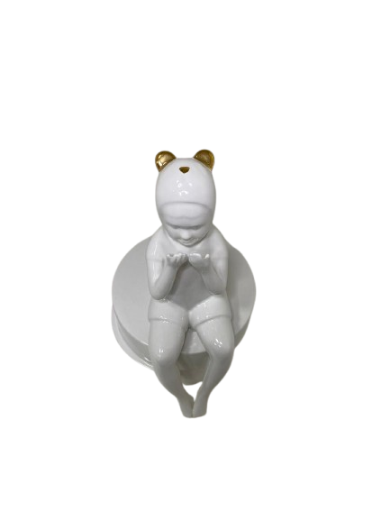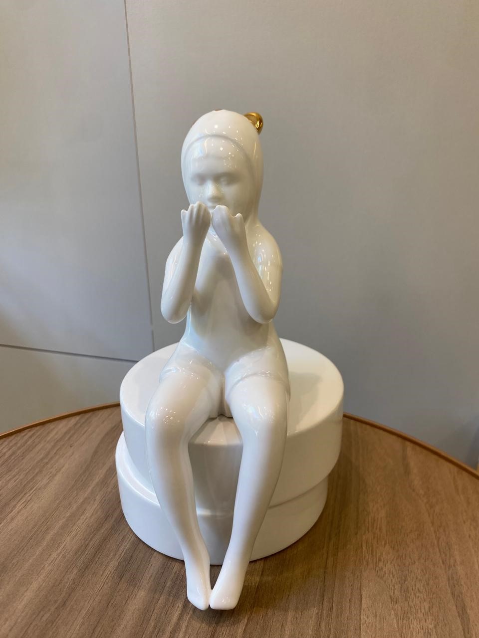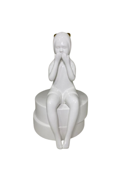 Escultura menina feita em cerâmica branca, com detalhe em dourado na touca.