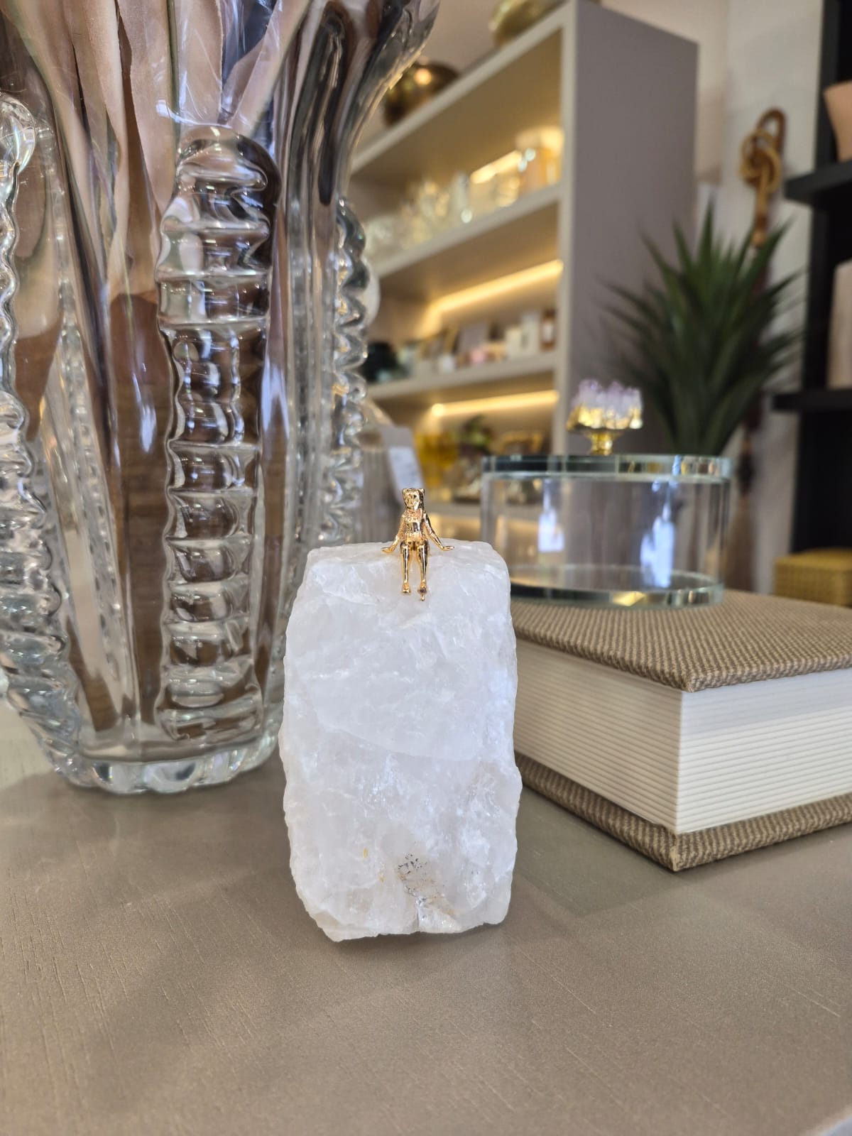 Trata-se de uma escultura decorativa composta por uma base em quartzo branco, que valoriza a peça com sua aparência natural, e uma figura de menina sentada em metal dourado, criando um contraste harmonioso entre os materiais.
