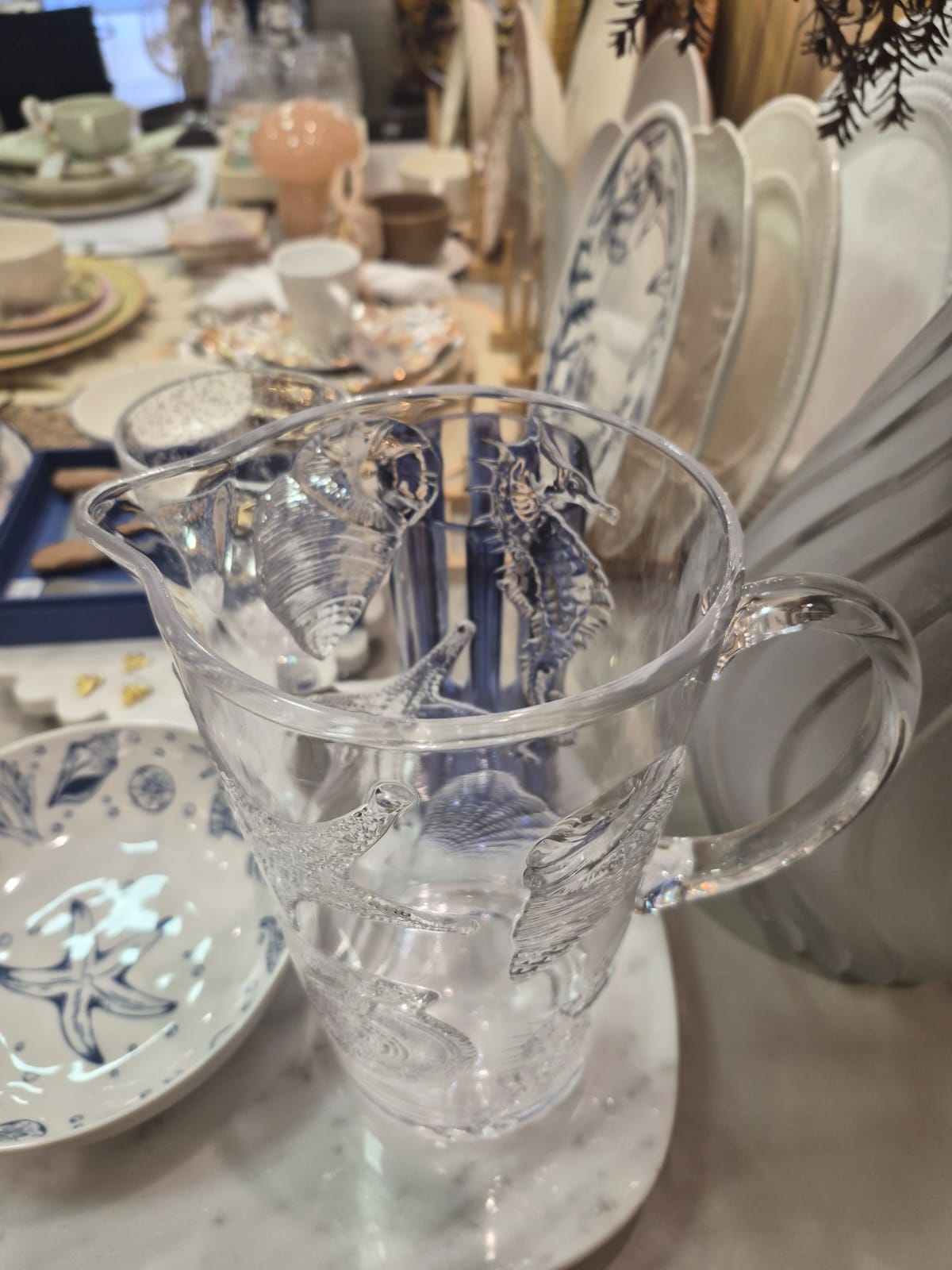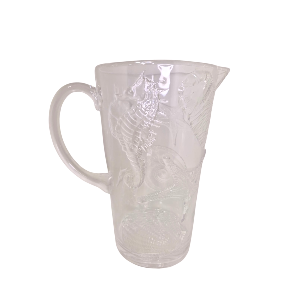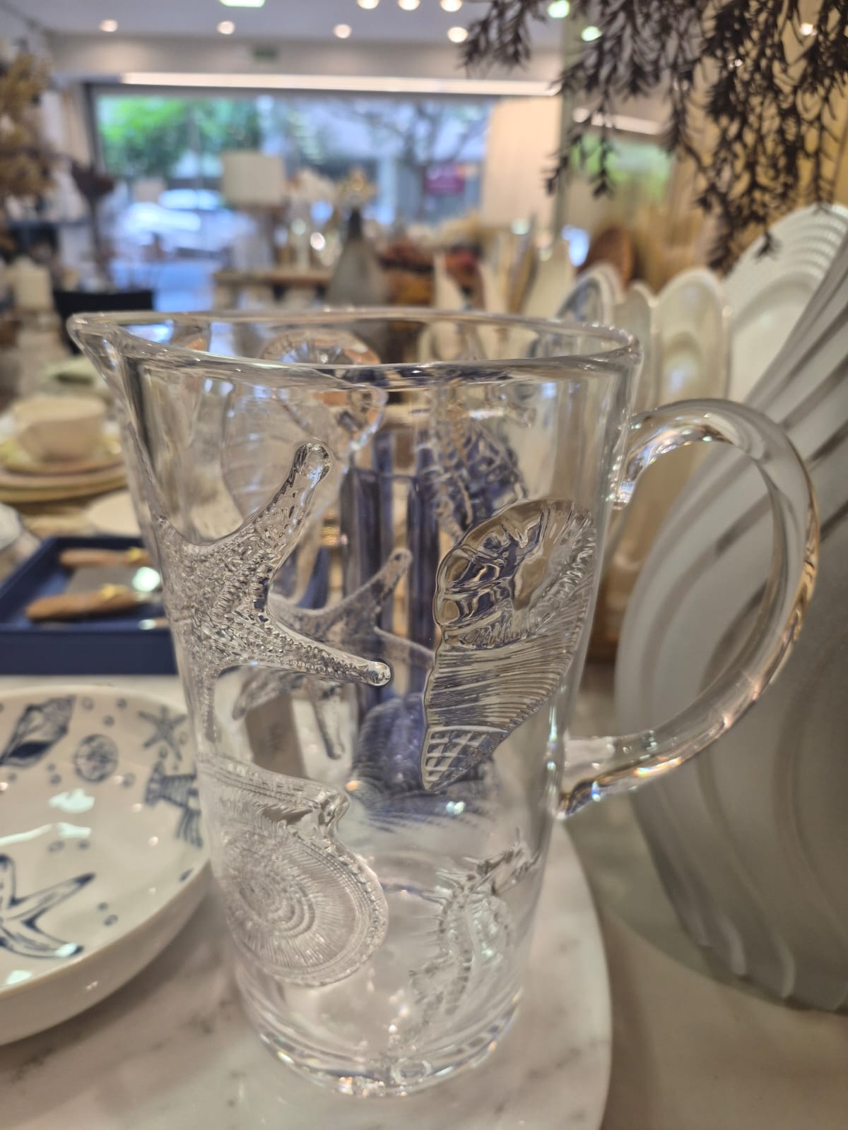 Trata-se de uma jarra produzida em acrílico transparente, com detalhes em relevo inspirados no fundo do mar, como conchas e estrelas-do-mar, que valorizam o acabamento e tornam a peça única.