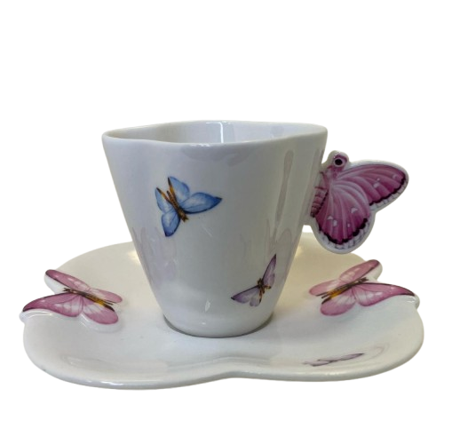 Jogo de 6 xícaras com pires para café, feito em porcelana com detalhes de borboleta 100ml