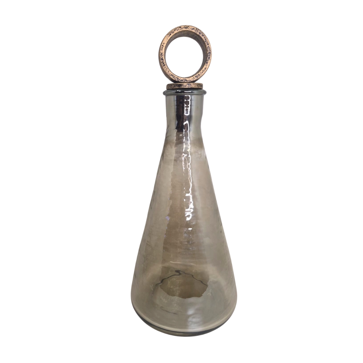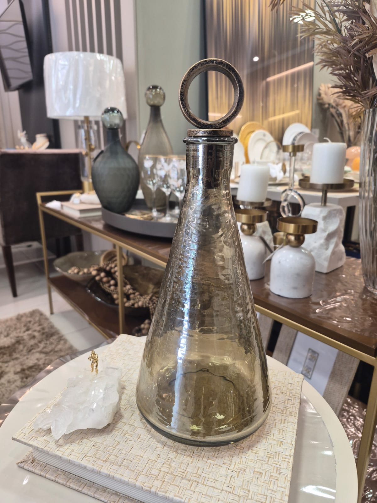 Trata-se de uma licoreira decorativa em vidro com acabamento levemente translúcido na tonalidade âmbar, acompanhada de tampa com detalhe em metal na cor ouro velho. Seu design alongado valoriza ainda mais a peça.