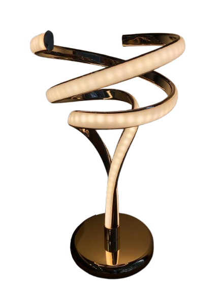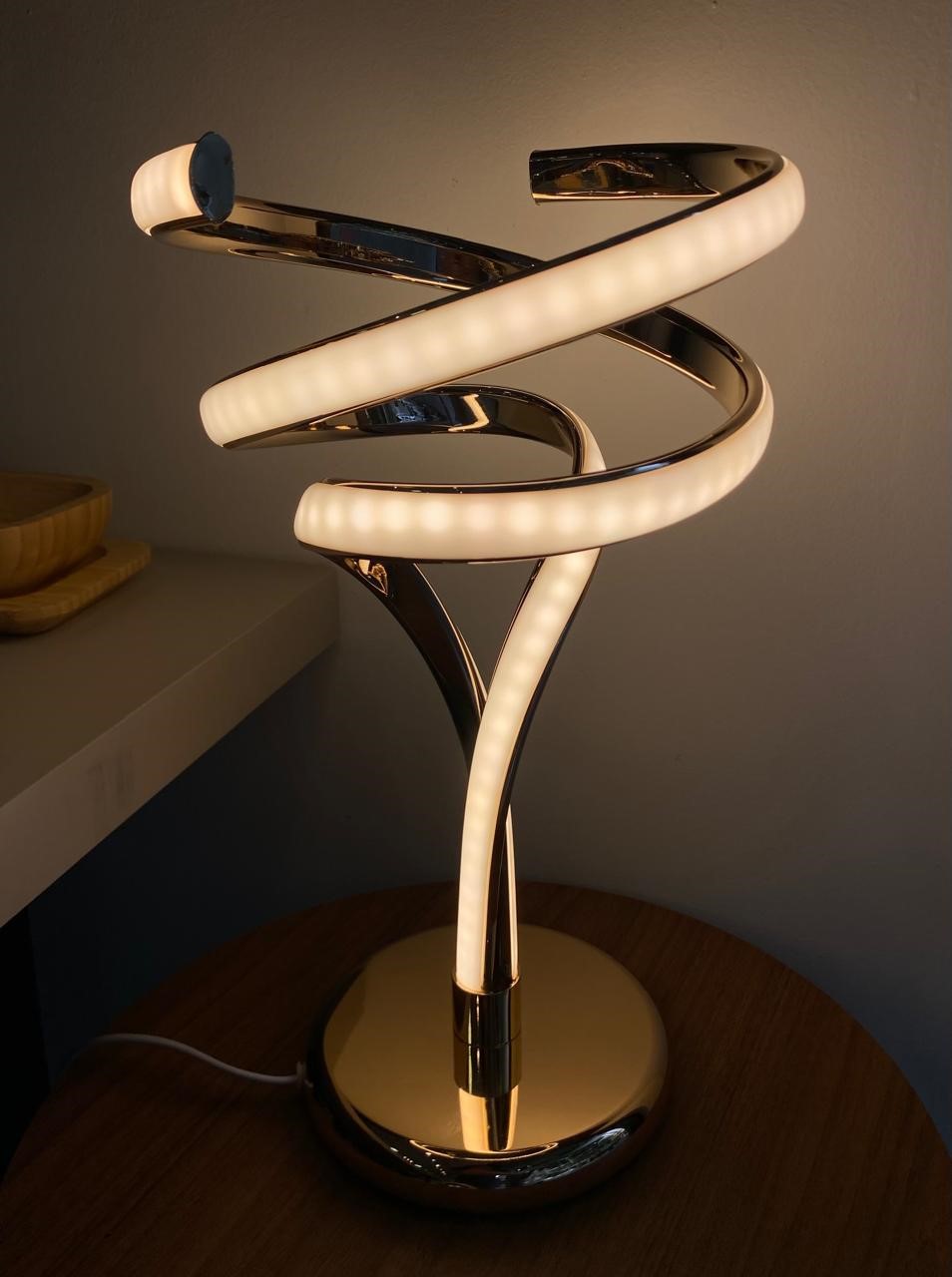 Luminária de mesa, feita em led na cor dourada, formato abstrato.