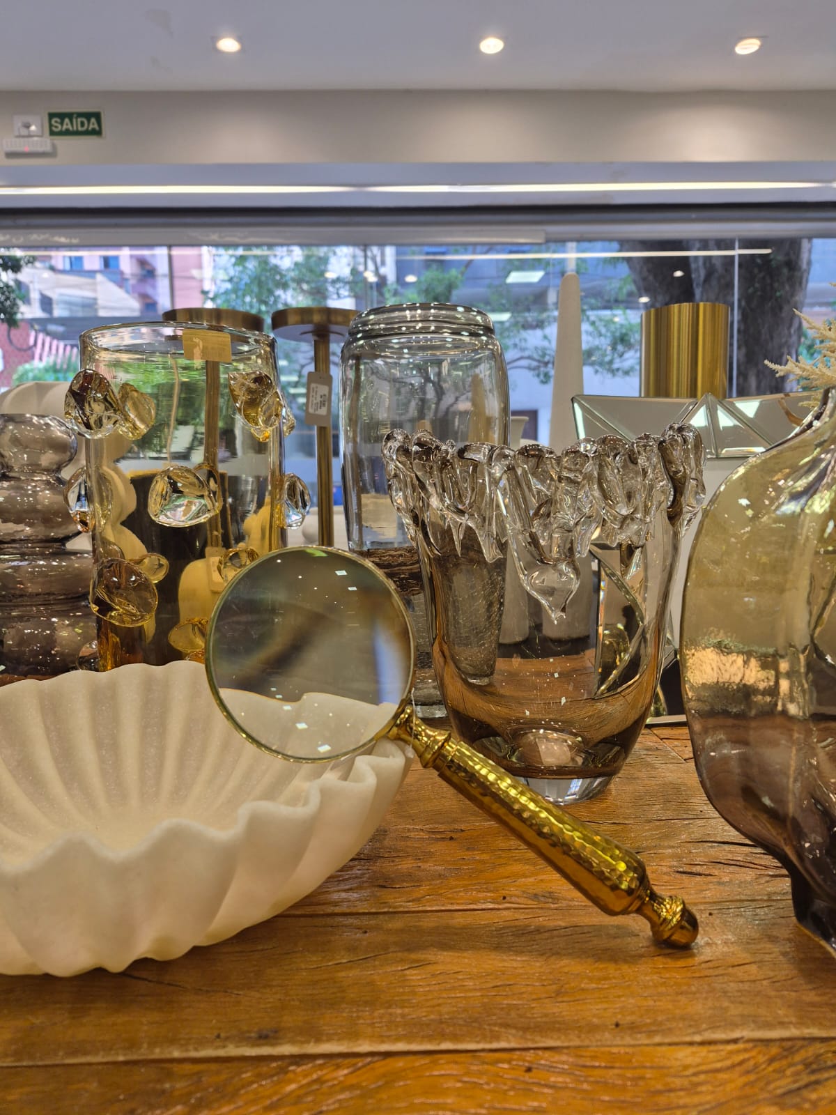 Trata-se de uma lupa decorativa produzida em metal dourado, com cabo em acabamento martelado que traz textura e personalidade à peça. Seu design combina o visual clássico com um toque contemporâneo, tornando-a um item decorativo de destaque.
