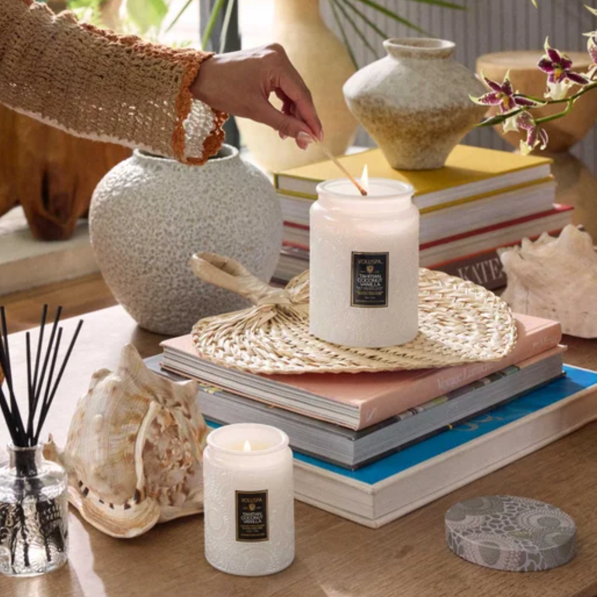 A Vela Voluspa Tahitian Coconut Vanilla é a definição de escapismo sensorial. Imagine-se descansando sob a sombra de uma palmeira, com a pele aquecida pelo sol e o som suave das ondas ao fundo. Esta fragrância traduz essa sensação de liberdade em um perfume quente, tropical e irresistivelmente acolhedor.