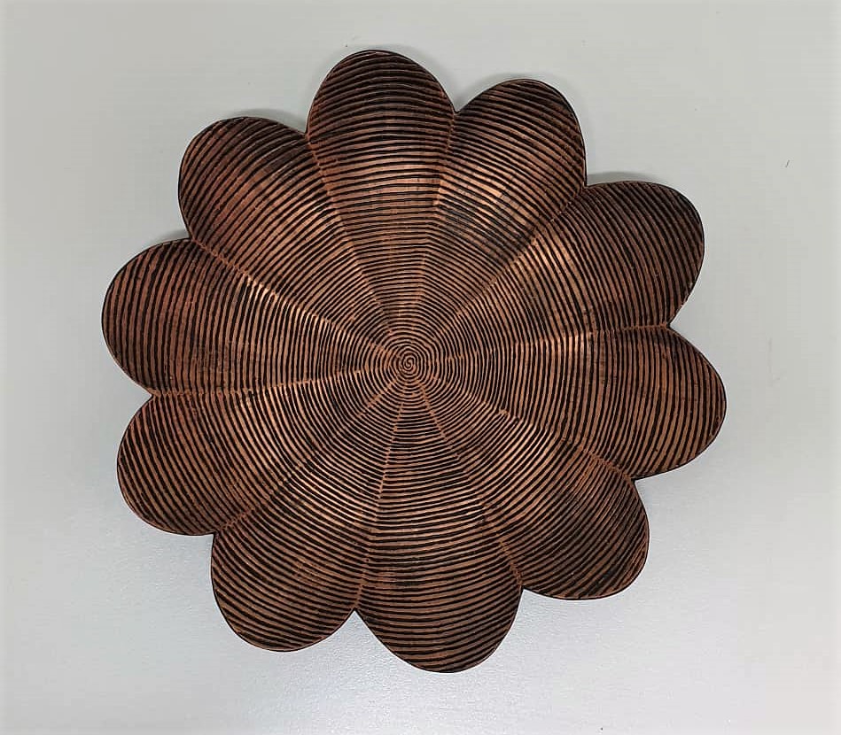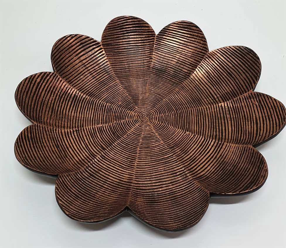 Objeto decorativo em resina na cor bronze com textura listrada.
