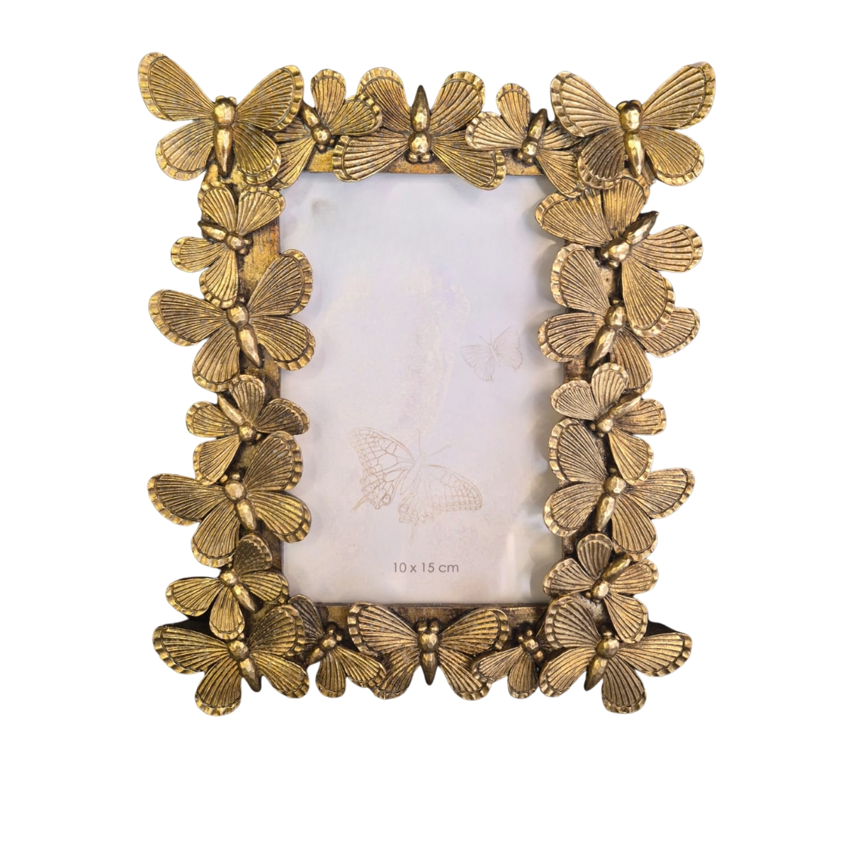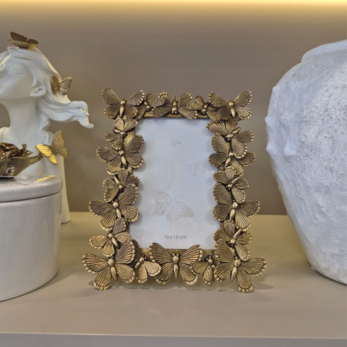 Trata-se de um porta retrato decorativo confeccionado em resina de alta qualidade, com moldura totalmente adornada por borboletas em relevo. O acabamento dourado realça cada detalhe, criando um visual marcante e refinado.
