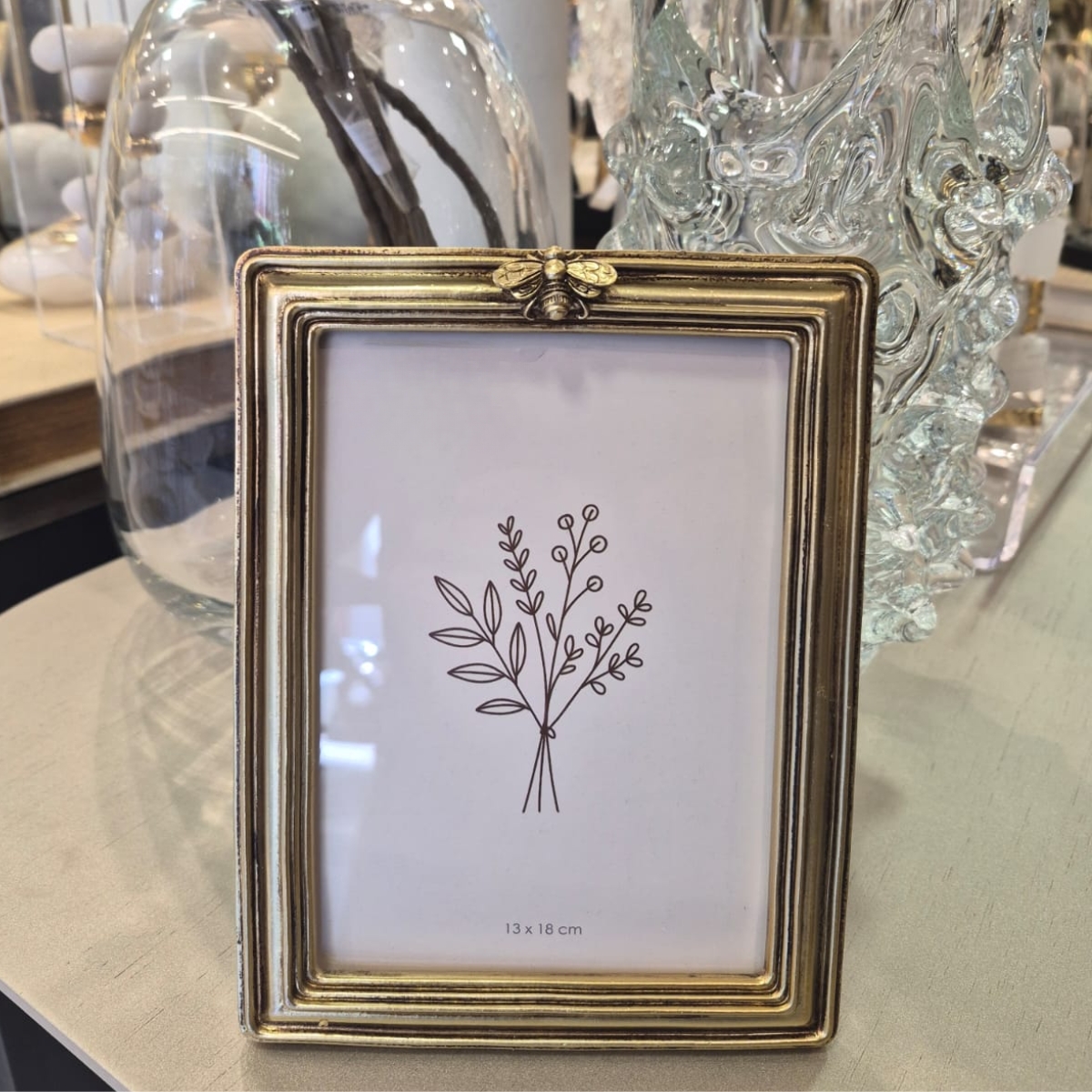 Trata-se de um porta retrato decorativo produzido em resina de alta qualidade, com acabamento dourado. Sua moldura apresenta frisos em camadas e um detalhe superior em formato de abelha, que enriquece o design e torna a peça única.