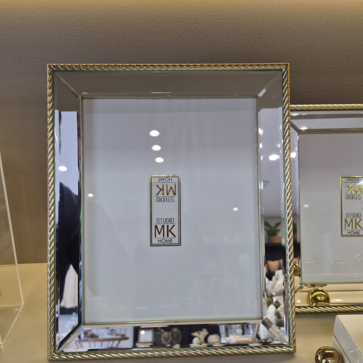 O Porta Retrato Espelhado com Moldura Dourada Trançada é uma peça sofisticada que une elegância e brilho à decoração. Seu acabamento espelhado aliado ao detalhe da moldura em dourado traz um toque clássico e refinado ao ambiente.