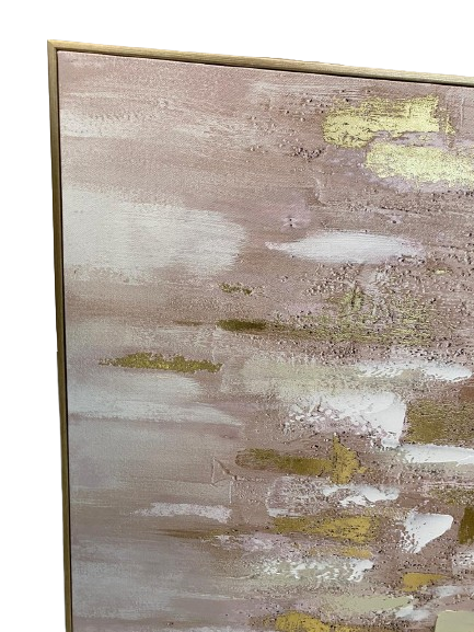 Quadro decorativo feito em canvas, nas cores branco, rose e dourado, e moldura em dourado.
