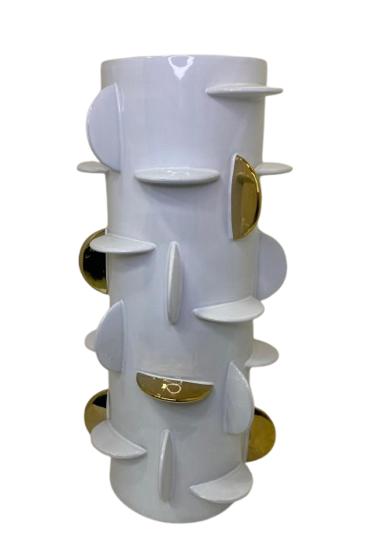 Vaso feito em cerâmica, na cor branco com detalhes em dourado.