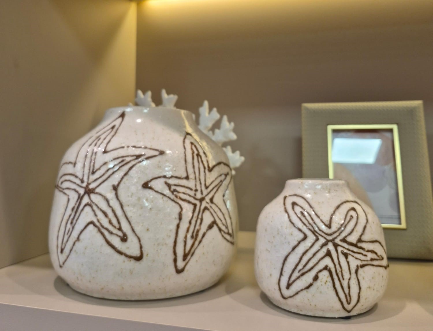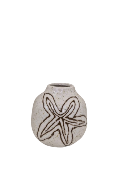 Vaso decorativo feito em cerâmica esmaltada na cor branca, com detallhes de estela do mar.