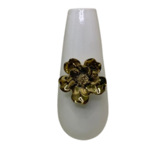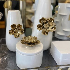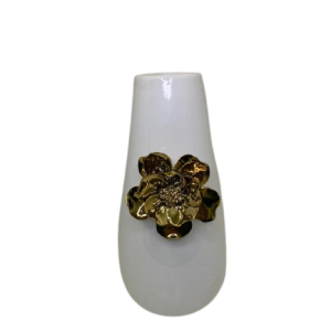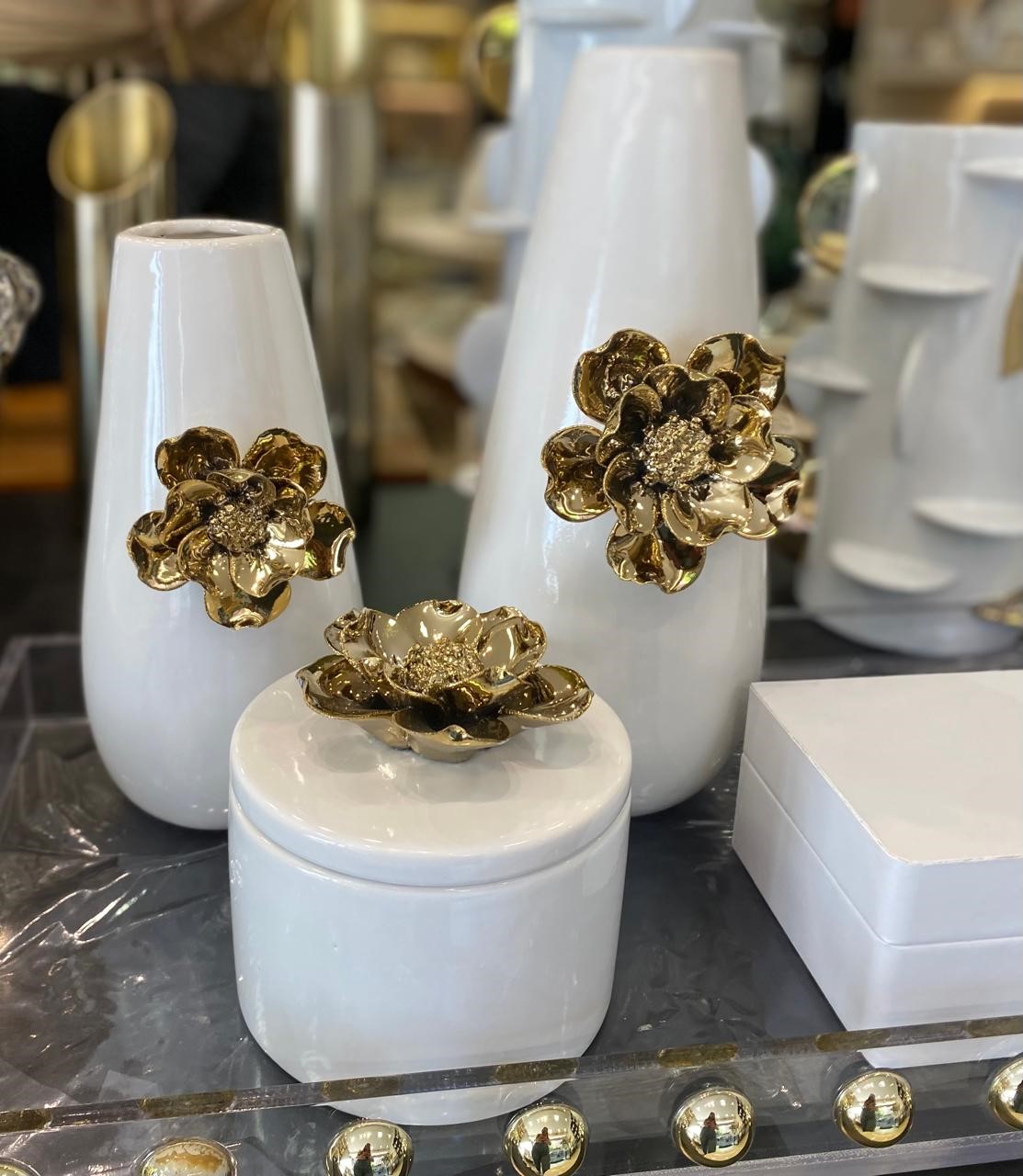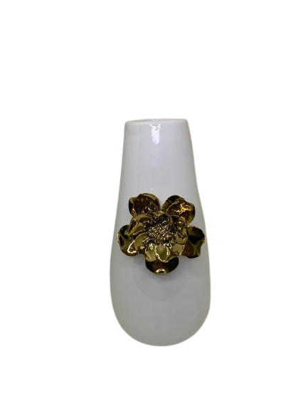 Vaso feito em cerâmica na cor branco, com detalhes de flor em dourado.