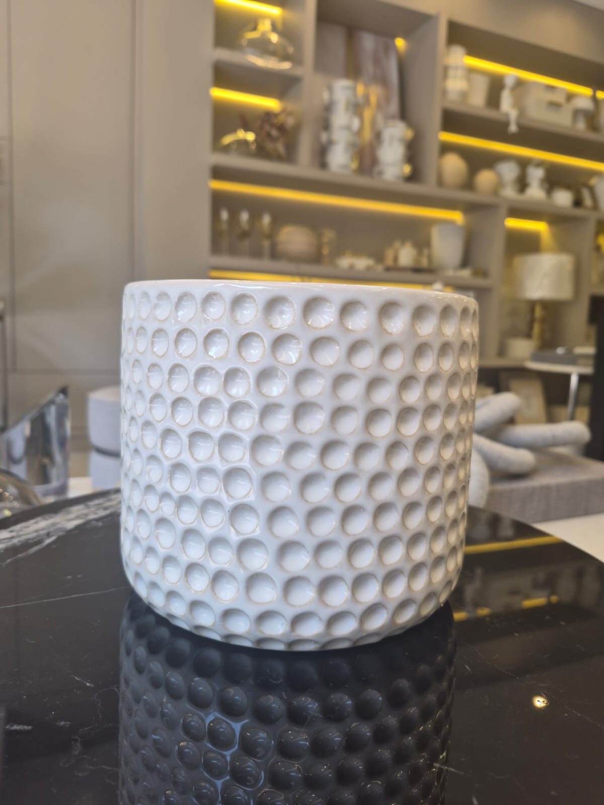 Trata-se de um vaso decorativo em cerâmica, com acabamento branco e superfície texturizada em formato de bolinhas (covinhas), que adicionam profundidade e um toque diferenciado à peça. Seu design contemporâneo valoriza tanto ambientes minimalistas quanto composições mais elaboradas.