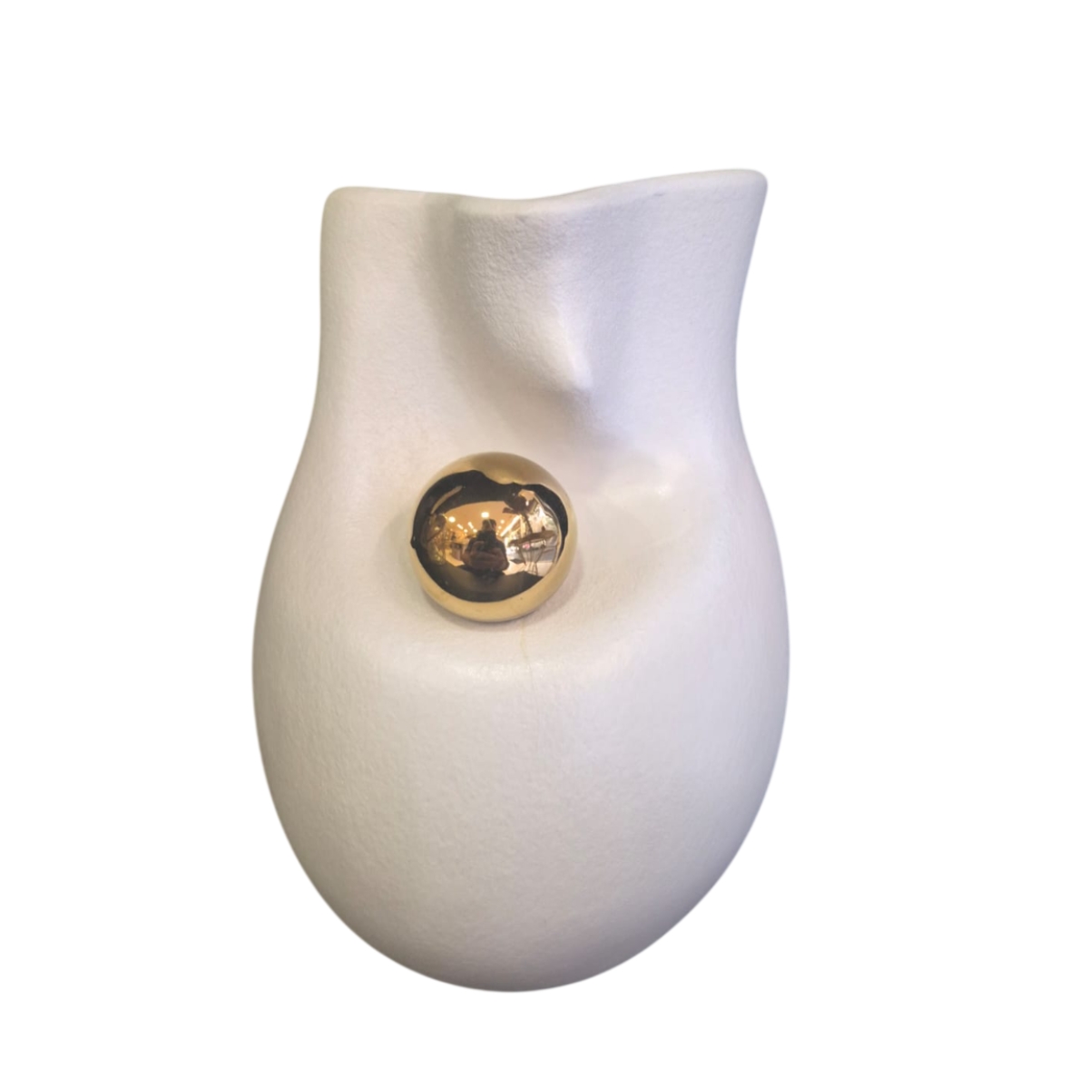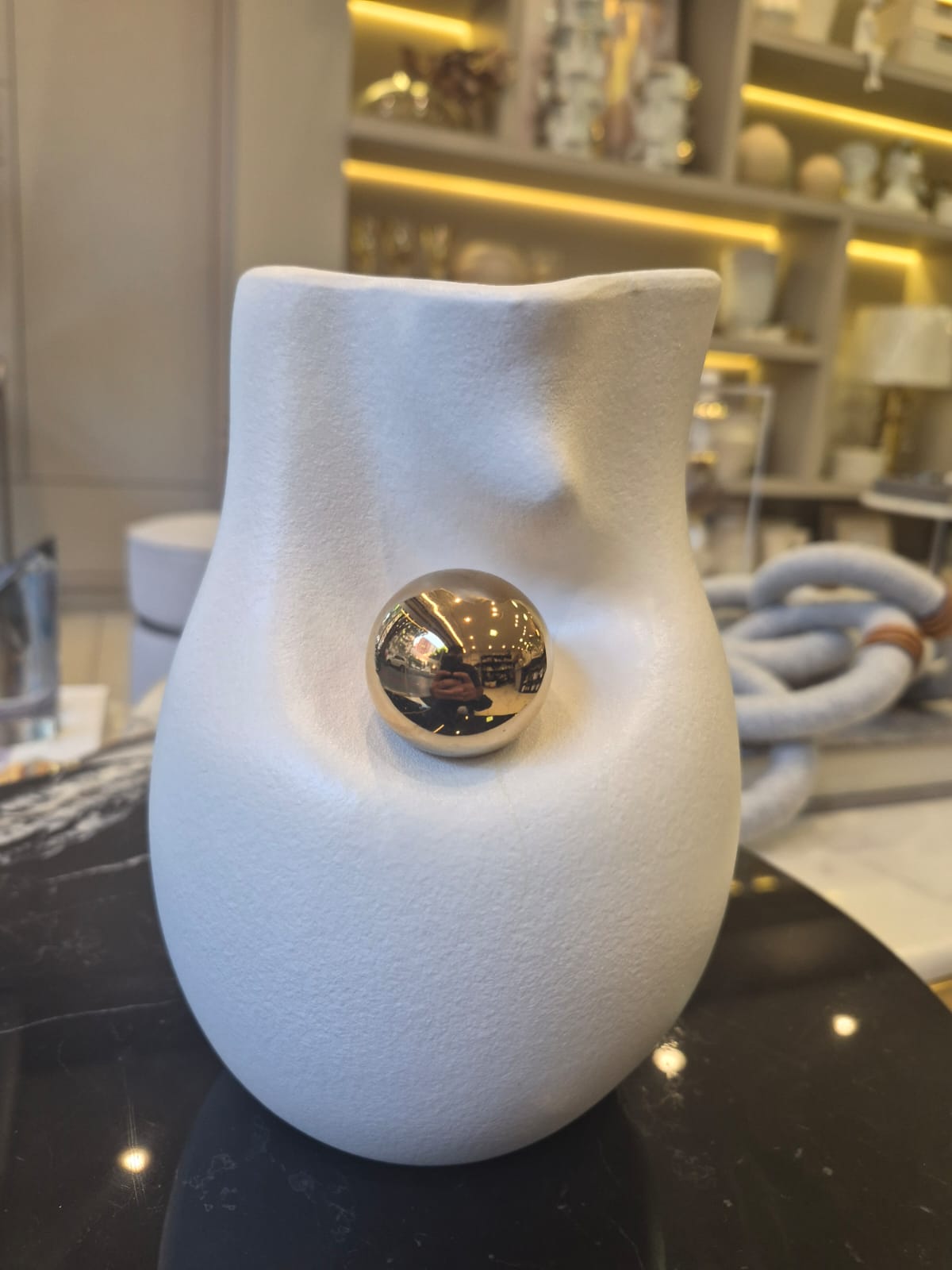 Trata-se de um vaso decorativo em cerâmica com acabamento fosco e textura suave, em tonalidade clara. O grande diferencial da peça é a esfera metálica aplicada na superfície, que adiciona brilho e sofisticação ao conjunto, criando um efeito visual moderno e exclusivo.