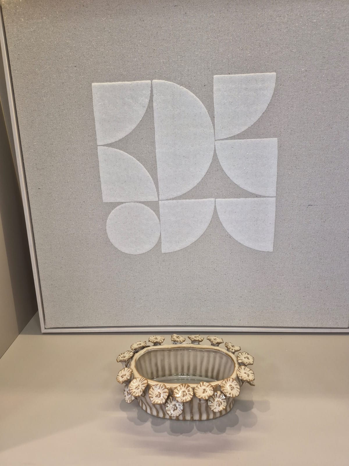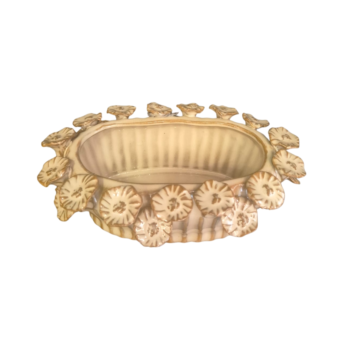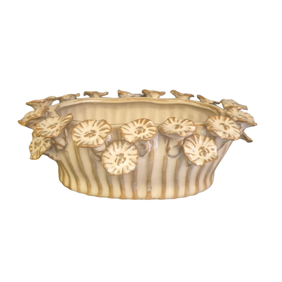 Trata-se de um vaso decorativo em cerâmica com acabamento texturizado e aplicação de flores em relevo ao redor de toda a borda. Seu formato orgânico e o cuidado nos detalhes fazem da peça um verdadeiro destaque visual.