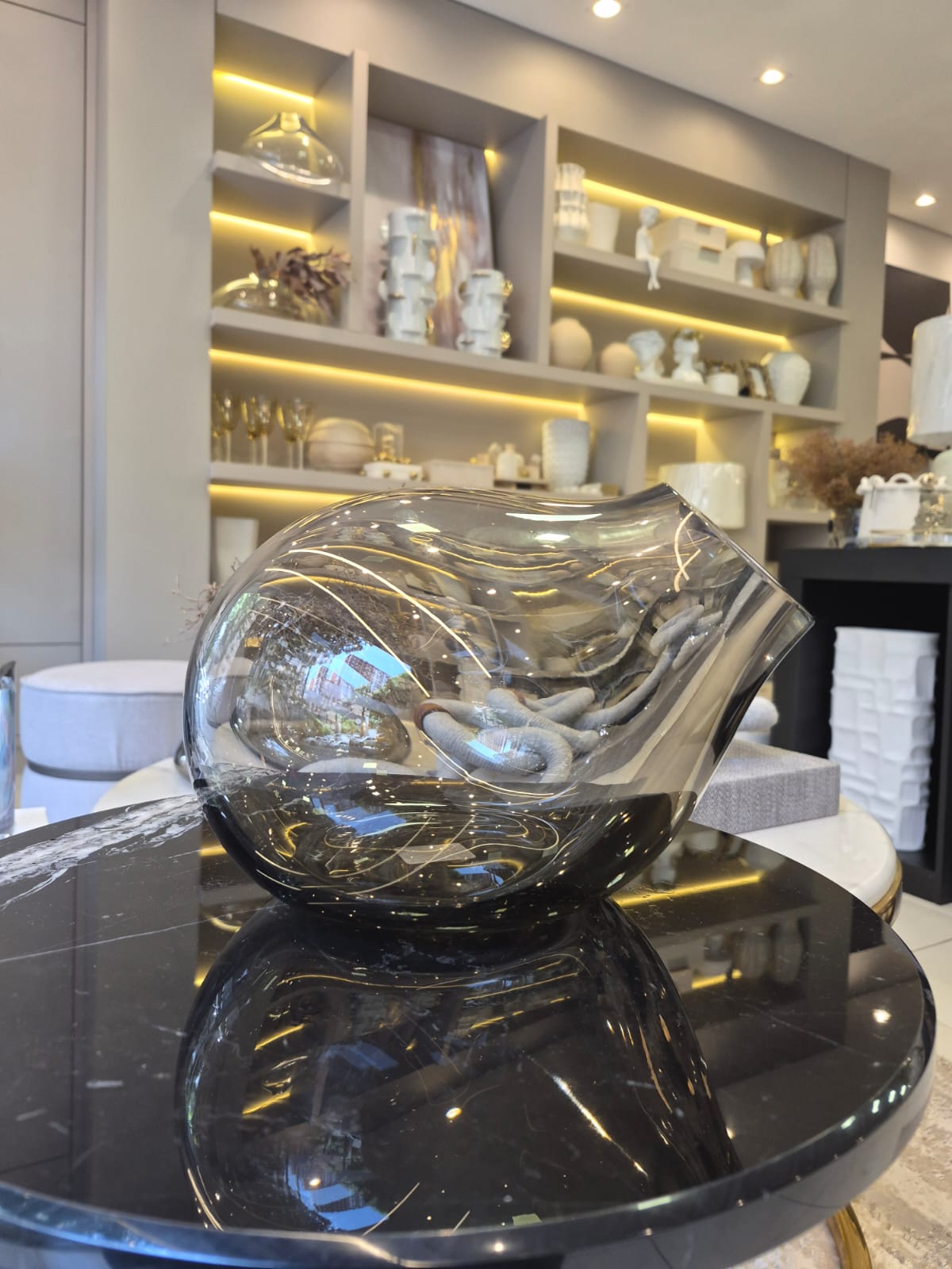 Trata-se de um vaso decorativo em vidro estilo Murano, na tonalidade grafite, com formato orgânico e acabamento translúcido. Suas curvas suaves e desenho fluido remetem ao trabalho artístico do vidro soprado, criando uma peça única e cheia de personalidade.