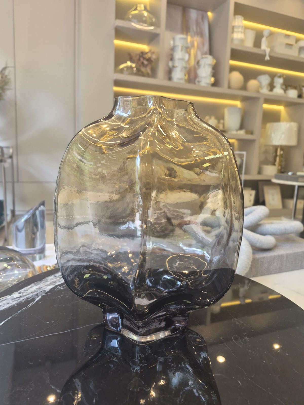 Trata-se de um vaso decorativo em vidro de alta qualidade, com acabamento em degradê que transita suavemente entre tonalidades, proporcionando profundidade e elegância à peça. Seu design versátil permite fácil harmonização com diferentes estilos de ambiente.
