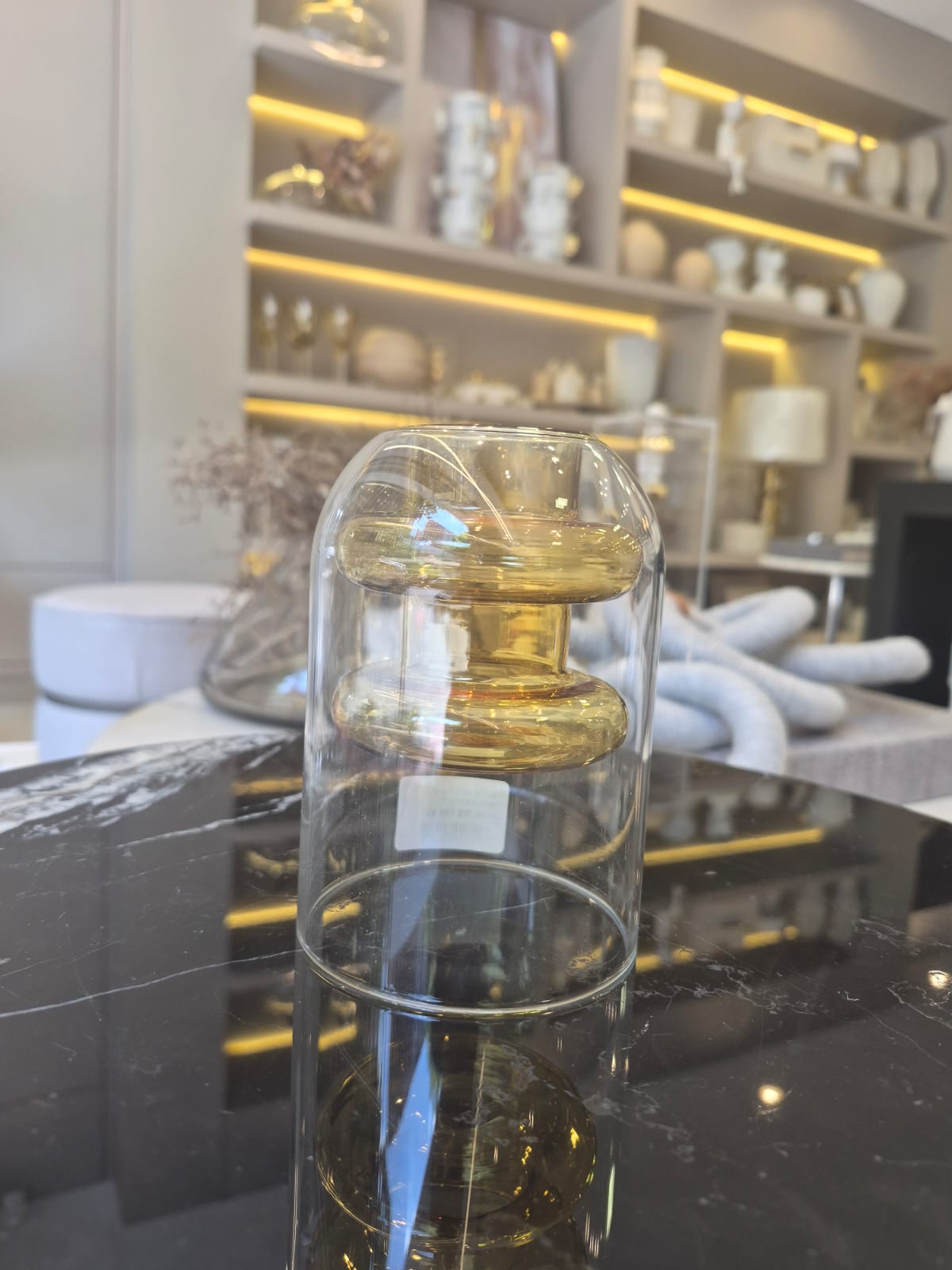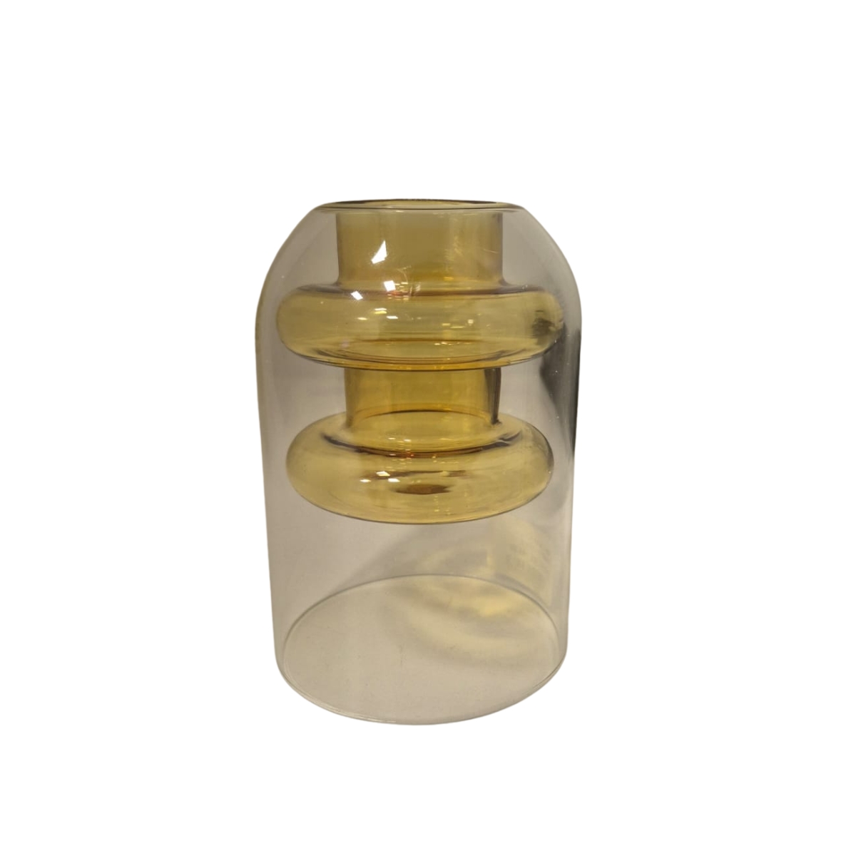 Trata-se de um vaso decorativo em vidro com estrutura de parede dupla, onde uma camada interna em tom âmbar é envolvida por uma camada externa incolor. Esse efeito cria profundidade, contraste e um visual contemporâneo único, valorizando ainda mais a peça.