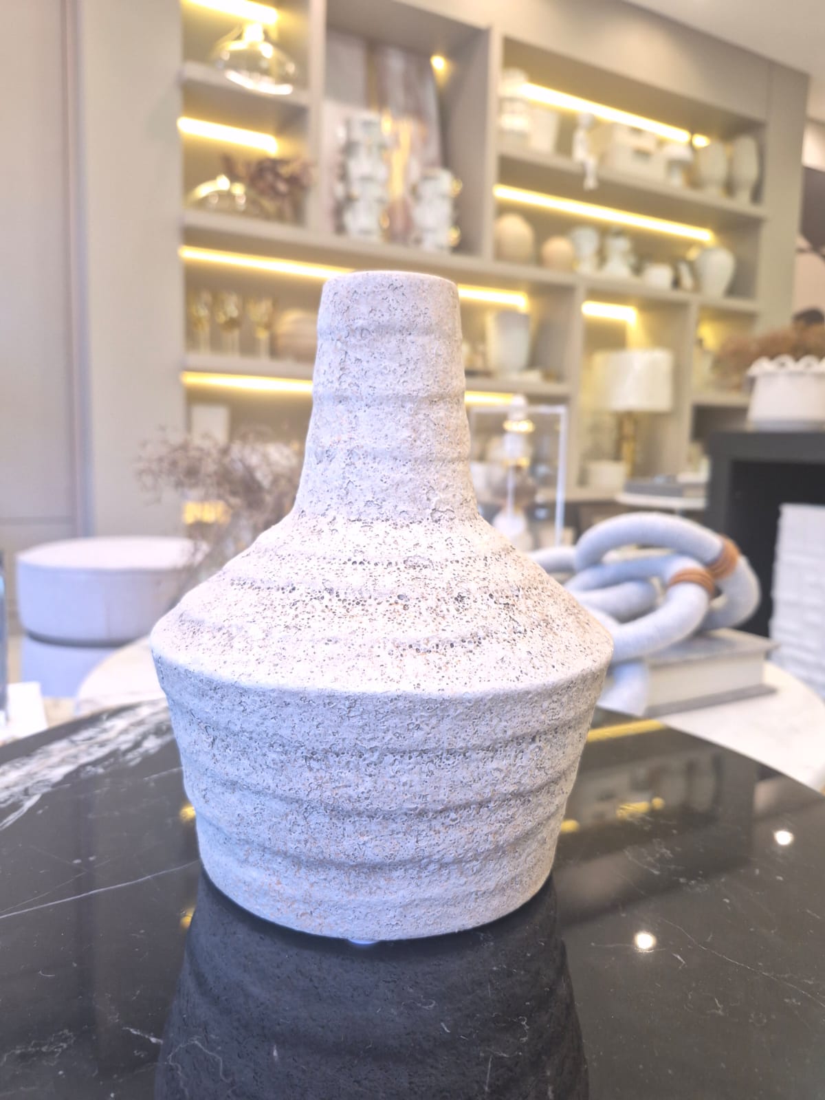 Trata-se de um vaso decorativo em cerâmica com acabamento rústico, que valoriza texturas e nuances naturais. Seu formato alongado com base estruturada e boca levemente estreita cria uma silhueta elegante e versátil, perfeita para diferentes propostas de decoração.