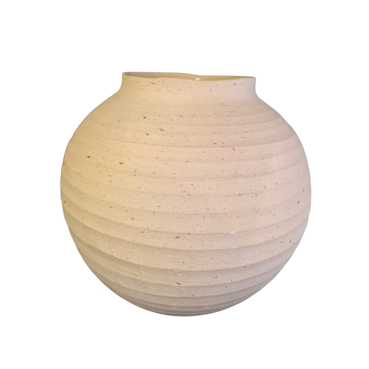 Trata-se de um vaso decorativo em cerâmica de alta qualidade, com tonalidade Terracota claro e acabamento levemente texturizado em linhas horizontais. Seu formato arredondado e volumoso proporciona destaque na composição decorativa.