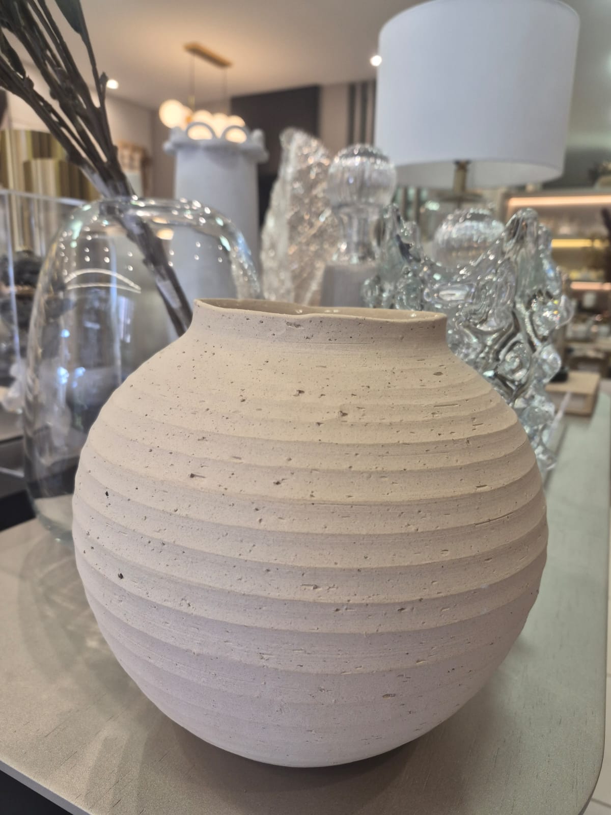 Trata-se de um vaso decorativo em cerâmica de alta qualidade, com tonalidade Terracota claro e acabamento levemente texturizado em linhas horizontais. Seu formato arredondado e volumoso proporciona destaque na composição decorativa.