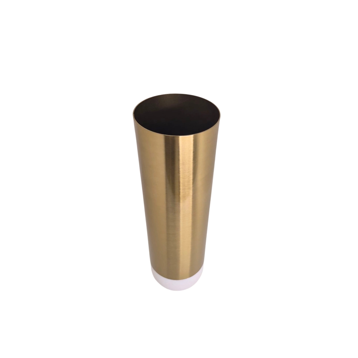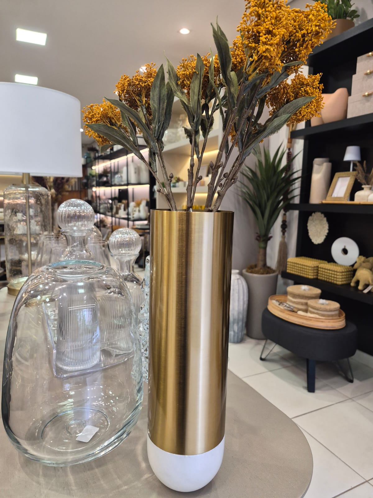Trata-se de um vaso decorativo com estrutura em metal dourado de acabamento acetinado, combinado com base em mármore natural branco. A união desses materiais cria um contraste harmonioso entre brilho e solidez, resultando em uma peça de forte presença estética.